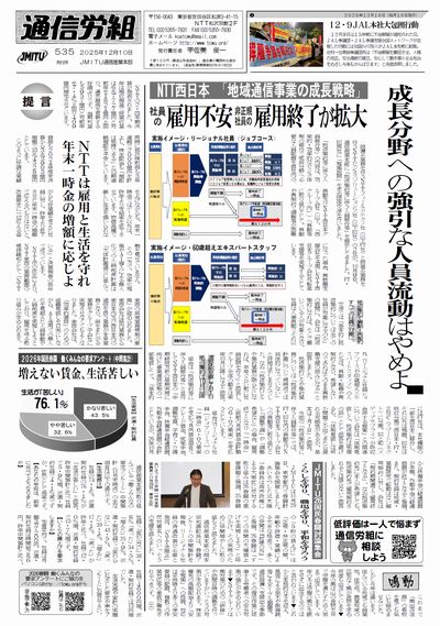 | NTTの2・四半期決算が発表されました。 今年は増収増益で営業収益は6兆7727億円と対前年を1821億円上回り、過去最高を更新する好調ぶりです。 当期利益も5957億円と対前年を7・4%上回り409億円増加させています。 同時に自己株取得も3年連続で2000億円を計上し、株主配当も「増配は堅持できる」と15期連続増配を予定しています。資産も2024年度末決算から3兆3903億円増額で33兆4528億円としています。 このように好調な業績を上げながらも、年末一時金ではデータ以外は、昨年より支給率を低下させています。 物価高騰で厳しい生活を強いられながらも好業績を支えた社員に対し、昨年より低下させた年末一時金の増額で応えるつもりはないと、改善要求に一切応える姿勢を見せていません。 その一方で、効率化施策やAI導入による無人化での人員削減計画は「大体計画通りに進んでいる」と決算報告の答弁で述べています。 NTT法の改正により、NTT東西の業務範囲の規律緩和として「NTT東西の県域業務規制の撤廃」が認められました。 東西会社は県内業務から東日本内及び西日本内の通信を扱う業務が本来業務となり、県をまたがる業務をグループ子会社に実施させなくてもよくなりました。 東西会社は、「効率的運営」のための組織見直しを口実にしながら、AI活用での無人化を見据えた人員移動や人員削減を実施しようとしており、雇用を守る取り組みが求められます。 |