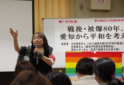 | 「戦後80年、憲法いかし、いのち、くらし、平和を守ろう」などのスローガンを掲げ、第70回はたらく女性の中央集会イン愛知が11月29日と30日、名古屋市内で行われました。 2日間でのべ750人が参加。ジェンダー平等と公平な社会の実現のため共同を広げることを確認しました。 1日目の第1分科会では「戦後・被爆80年、愛知から平和を考える」をテーマに通信産業本部の大村美恵さんが助言者として発言。 義理の父が長崎で被爆し、夫は被爆2世。無脳症でこの世に3時間しか生きられなかった我が子のために核兵器禁止を訴えながら昨年、東京から広島まで通し行進をしたことを中心に草の根平和運動を呼びかけました。 愛知県平和委員会事務局の矢野創さんからは、身近にある軍需工場の実態を学び、6歳の時、広島で被爆した黒田レオンさんが当時のことを話されました。 2日目の全体会で主催者あいさつした高木りつ実行委員長は「連帯し、沈黙せず、私たちが望む社会をつくろう」と呼びかけ、寺園通江事務局長は、労働時間規制の緩和やジェンダー視点の政策を逆行させる高市早苗首相を批判しました。 たたかいの交流ではNTT法廃止反対署名の協力を大村美恵さんが訴えました。 |