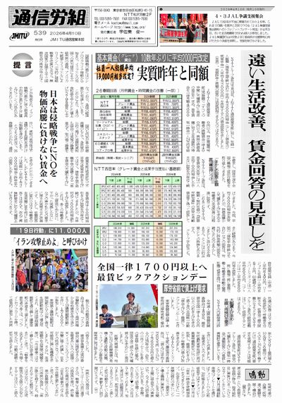 | 国際情勢の悪化はロシアのウクライナ侵略から始まり、イスラエルの他国への武力侵攻による一般市民の虐殺、アメリカ大統領とイスラエルによりイランへ一方的に侵略戦争を仕掛けるなど、無法国家が台頭する下で国際社会の秩序が守れなくなっており、各国の経済悪化も加速しています。 これらにより、4月の食料品を中心とした値上げが2798品目に上ることが発表され、イラン情勢の悪化に伴う原油高や円安が進むとさらに値上げラッシュの恐れがあるとされています。 国内も円安が進み物価高騰のもとで、各政党が公約で掲げた消費税減税も国会では実施の論議を進めず、別の場で論議を行い、減税の実効性は不透明のまま国民生活だけが困窮を深めています。 そのような状況で、26春闘がたたかわれ、通信産業本部は格差拡大で不平等な成果手当引き上げではなく、特別手当や退職手当の基礎となる「基本賃金の大幅引き上げ」を求めてたたかってきました。 しかしNTTグループは実質一人平均1万2000円相当と昨年並みの回答しか示しません。 基本賃金は700円相当引き上げ回答を10年近く続けてきましたが、今年初めて2000円相当引き上げを回答しました。 これは、多くの労働者からの「賃金が上がらない。下がった実感しかない」などの声や私たちの要求に押され実現させた改善です。 しかし、低額回答に変わりはなく労働者の生活実態に目を向けた回答とは言えず、改めて再検討要求に応え大幅賃上げを行うべきです。 |