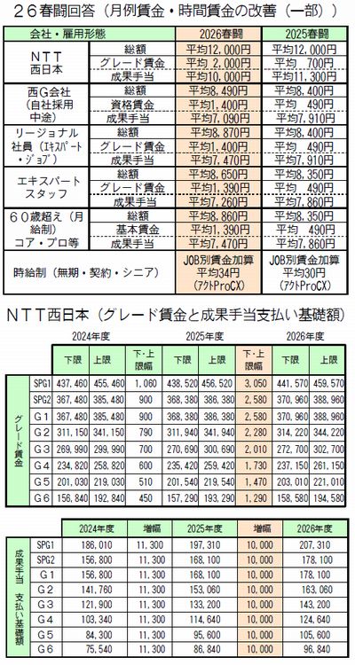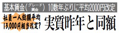 | NTTグループ各社は3月18日、JMITU通信産業本部に対し、社員一人総額(特別手当反映分含む)平均1万3000円相当(グレード賃金及び成果手当一人平均1万2000円)を改定するとの賃金回答を示しました(左表)。 実質昨年と同額の回答には到底納得できるものではありません。 |