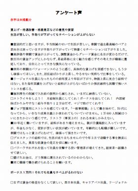 | ■物価高なのに税金だけ上がる。賃金が上がっていないので生活が苦しい。会社は、社員の生活を守る気はないのでしょうか。このまま退職金も不十分のまま老後を向かえるのは非常に不安です。50代になってもその月々生活するだけで精一杯で老後の資金を貯める余裕すらない。大企業らしくない。とにかく賃上げを早く実現して下さい。 □生活が苦しいので賃金を上げる取り組みをお願いしたい。 □プロスタッフの給料では生活が成り立ちませんので今年3月で退職する事を課長に伝えました。異常な低賃金の是正を切に願います。 ■給料が安いのに、リストラされたら堪らない! ■給料査定がジョブ型成果業績主義に変更されたが基準が高すぎて、どこまでやらないといけないのかという強迫観念が生まれ、日々疲弊している。 また業務以外(関連のない業務)が増えている。そのような業績に関わらないものは評価されてない事にも不満がある。手取り支給額に不満がある為より一層強く感じる。 ■リージョナルになり賞与がかなり大幅に下がってしまった。とても生活ができないくらい苦しくなり、大変困っている。全くモチベーションが上がらない。賞与をもっと上げて欲しい。 □ProCx社は、ボーナス・退職金もなく、最低賃金が上がると、調整賃金を下げて表向きは上げているように見せかける行為を長年行っており、現場で働く人の生活は困窮している。インセティブ制もシフト遵守と成果賃金がセットとなっており、体調不良等、やむを得ず休暇を取得した際、その日の成果賃金が0円になるという劣悪な制度が公然と行われている。 これではモチベーションも上がらず、何の為に年休が制定されているのかわからない。 □まずは賃金の格差をなくして欲しい。西社員、CP、リージョナル(エキスパート、ジョブ)同じフロアで同じ仕事をしているのに、ボーナスが手取り70万、50万と貰っているのに私は1万円でした。給料にも非常に格差がある。それでも社員だからと言われるがモチベが上がる訳がない。 ■同一労働、同一賃金?嘘ばっかり。同じ仕事でも天と地程の差がある。ボーナス?寸志でした。お餅代にしかならない。死ねってことなのか? ■格差社会である。気にいられたら正社員になれ、リージョナルは単なる雇用止め。賃金の格差は広がるばかり。辞めろと言わないばかりに。こんなのじゃ結婚を諦めるしか無い。汚い会社だ! ■絶対評価でも元の額が安いから、西、CP社員とはあまりにも格差がある。同じ仕事をしているのに組合は何をしているんだ。この手取りでは結婚はできない。1人で生きていくので大変です。このしんどさわかります? |